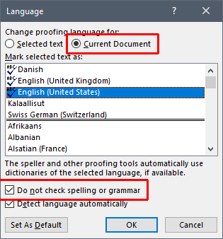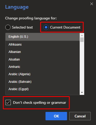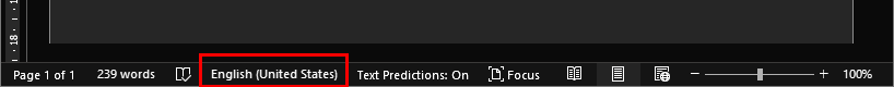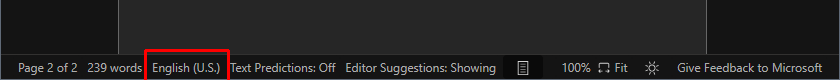 In Word, both desktop and online, this is done via the language changer at the bottom of the document's window, though the interfaces look slightly different. Look for something similar to: